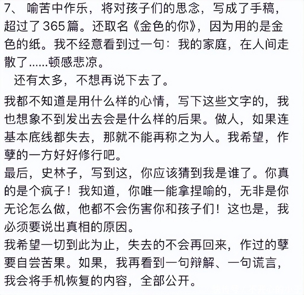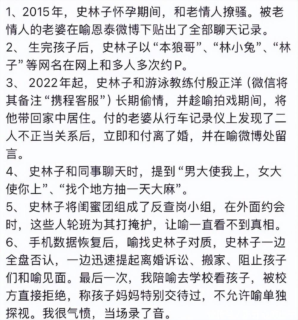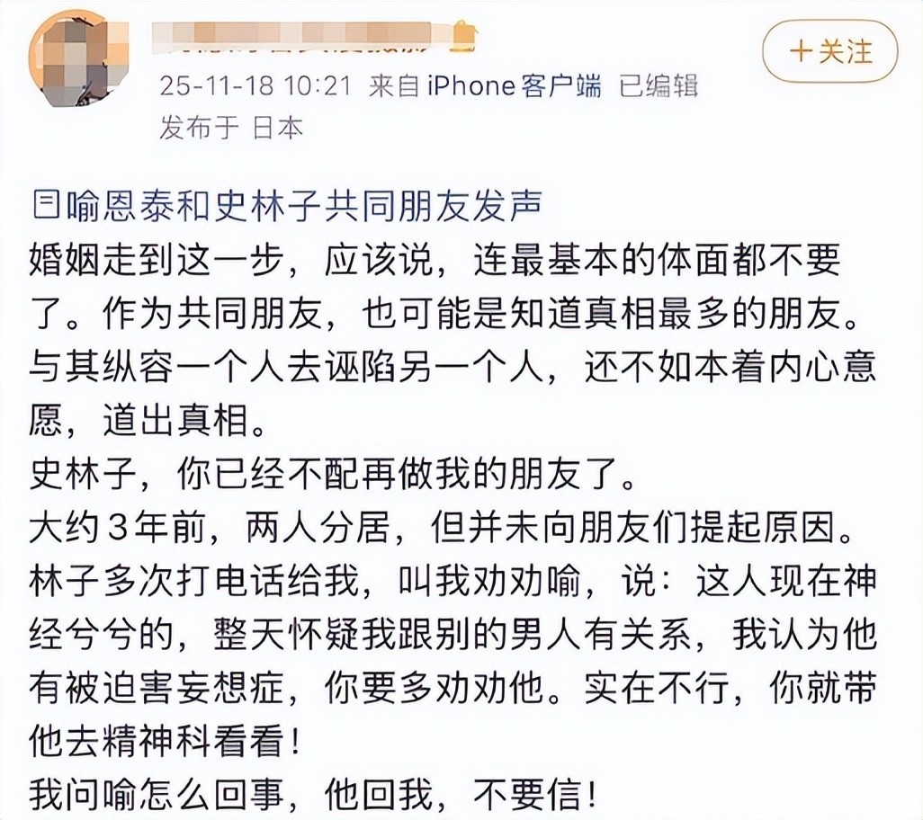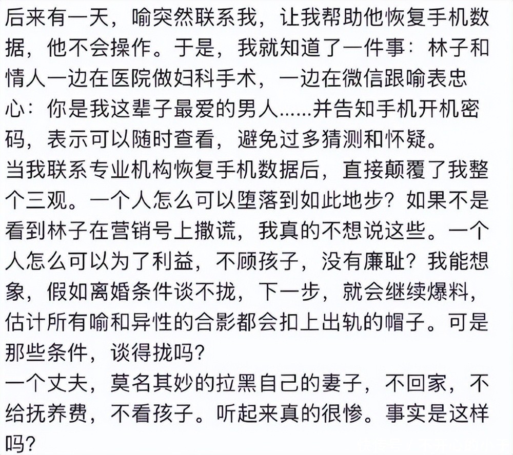 10月22日,一位自称是喻恩泰与史林子“共同好友”的网友,在社交平台发布了一篇长文,附带多张聊天记录截图和录音片段,彻底颠覆了舆论风向。这位好友表示,自己实在看不下去喻恩泰被“污蔑”,决定站出来“还原真相”,撕开史林子的“贤妻”面具。